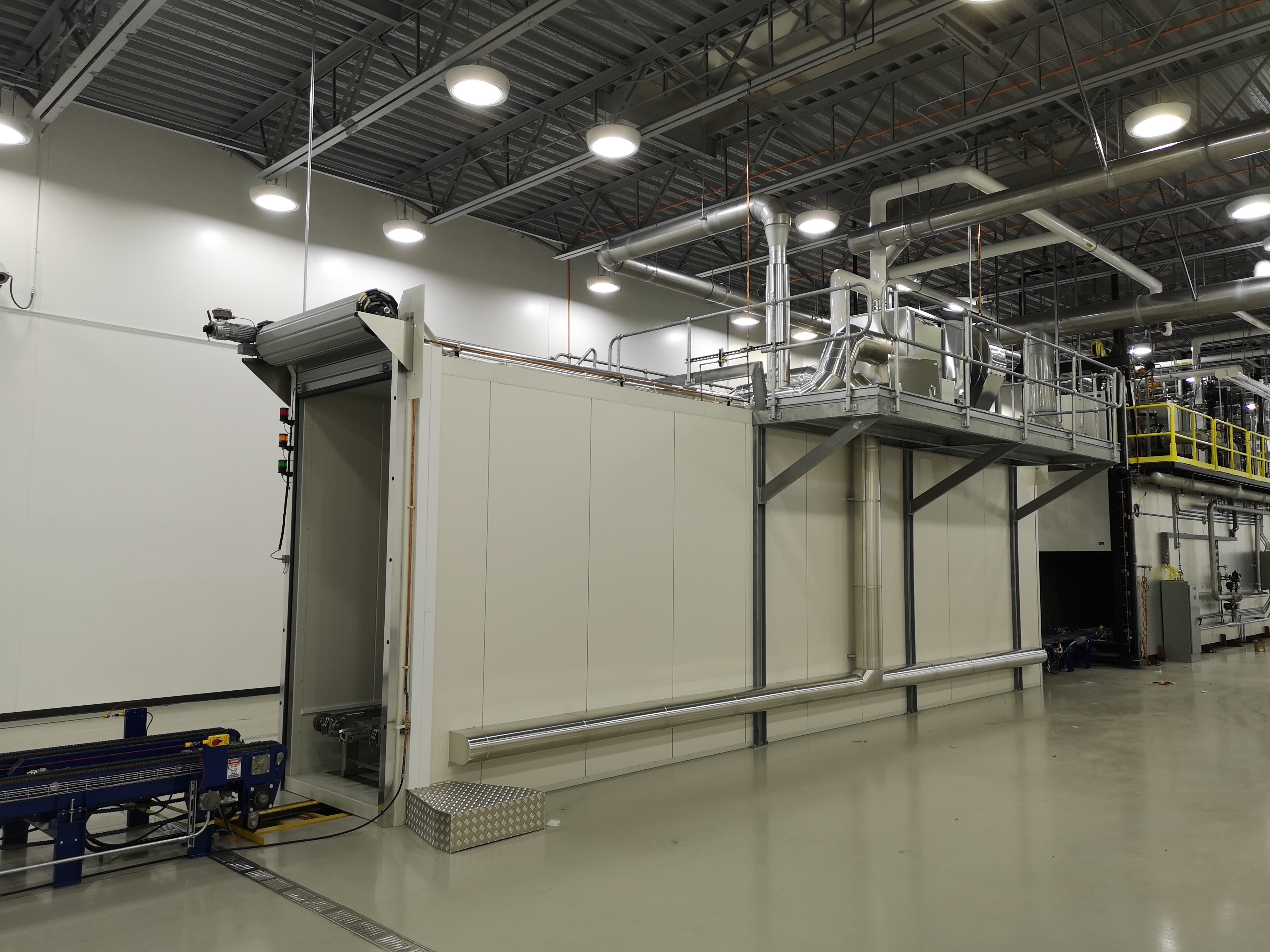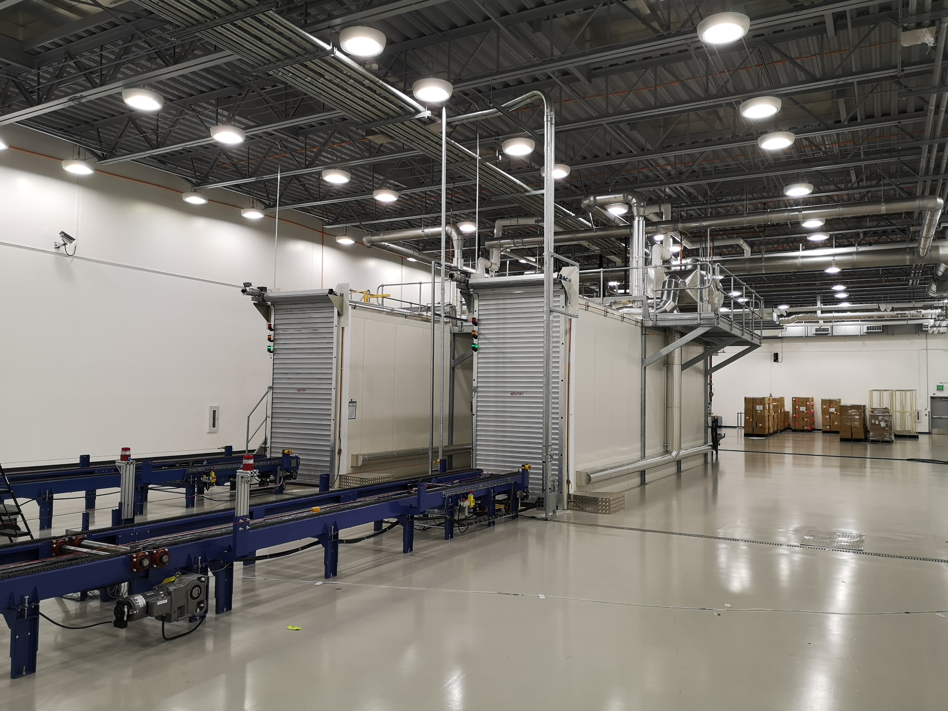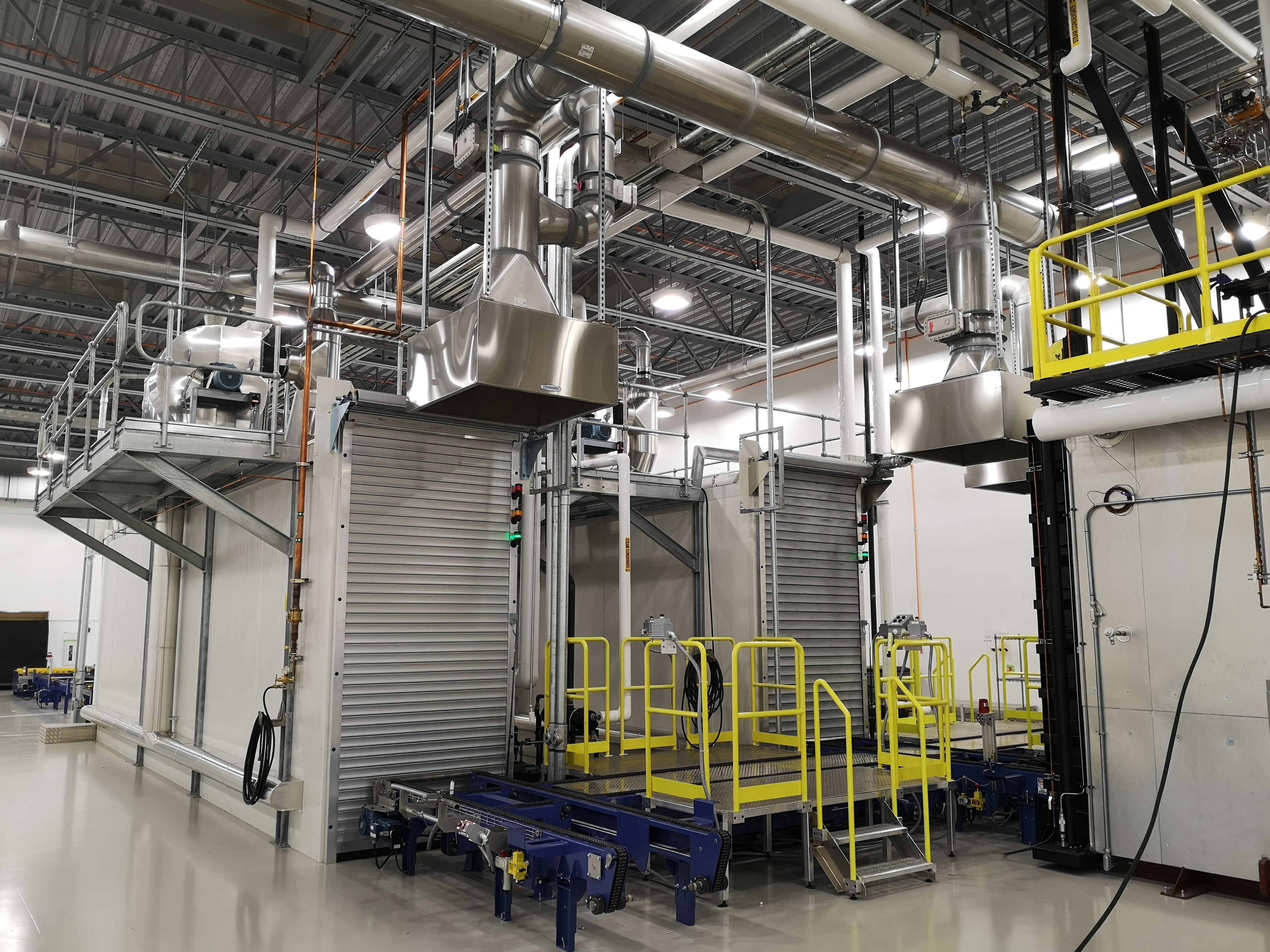 Product on pallets placed in a closed, insulated chamber where air flow, temperature, and relative humidity are evenly distributed and maintained at pre-set values.