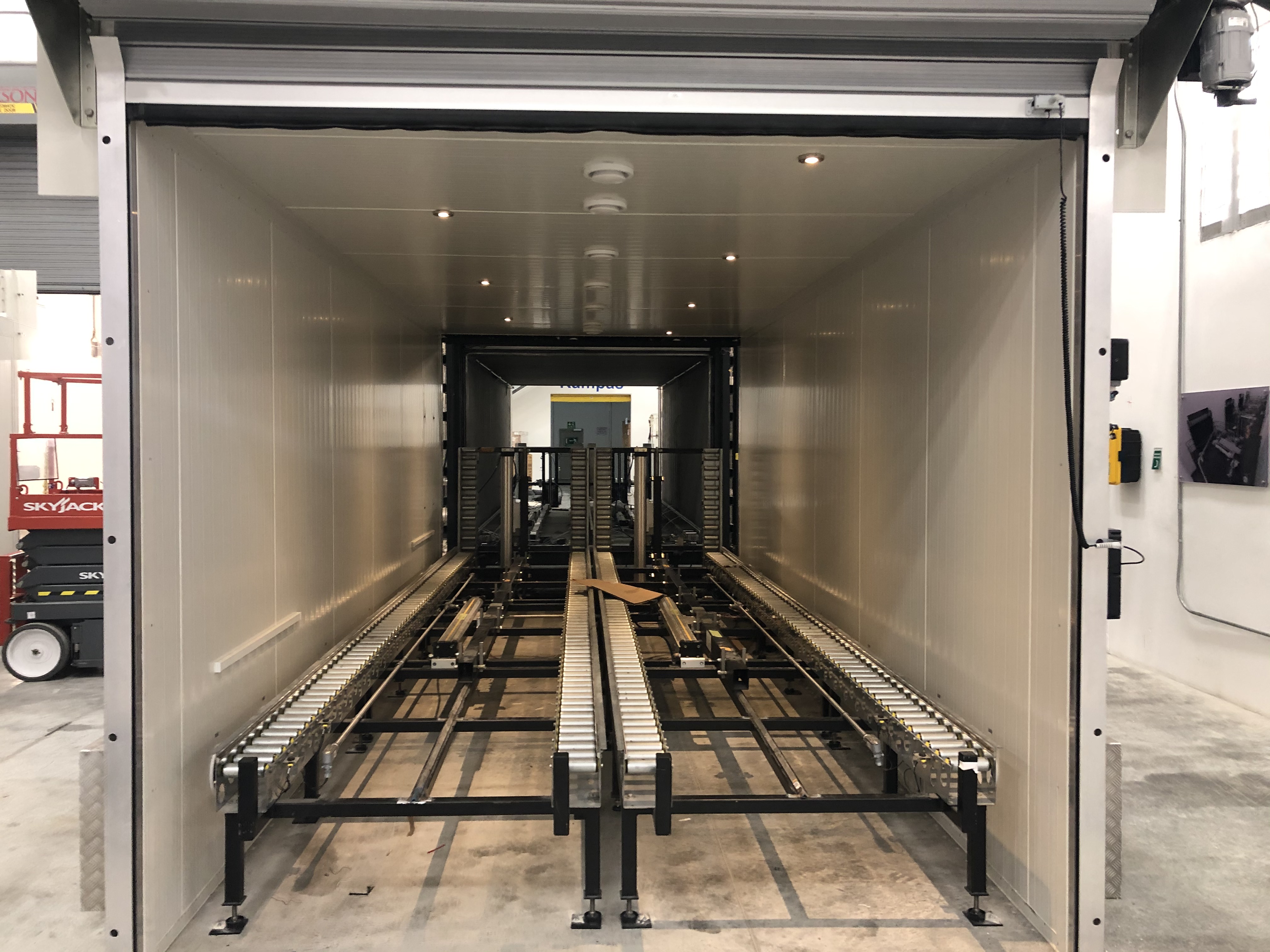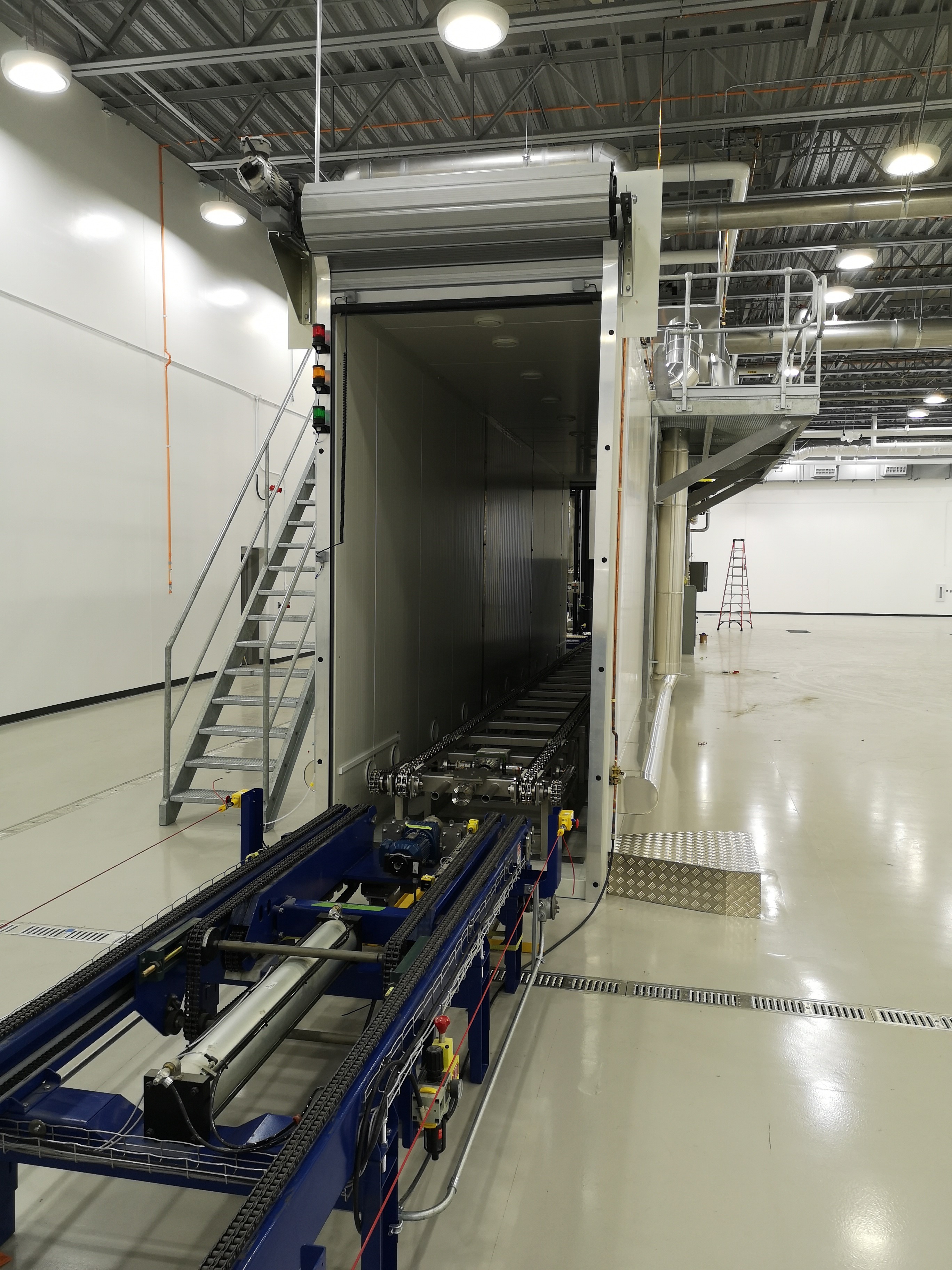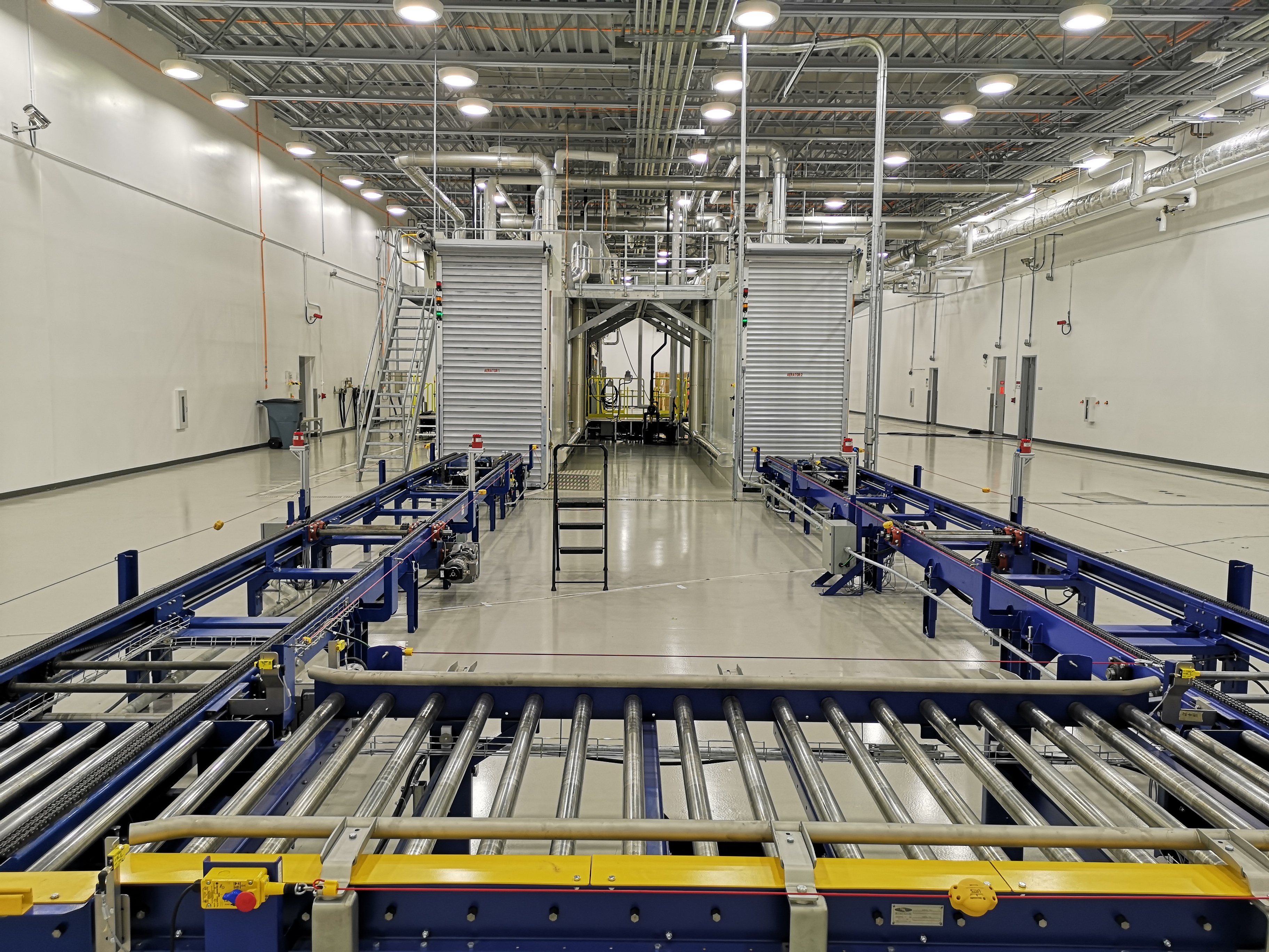 Product on pallets placed in a closed, insulated chamber where air flow, temperature, and relative humidity are evenly distributed and maintained at pre-set values.