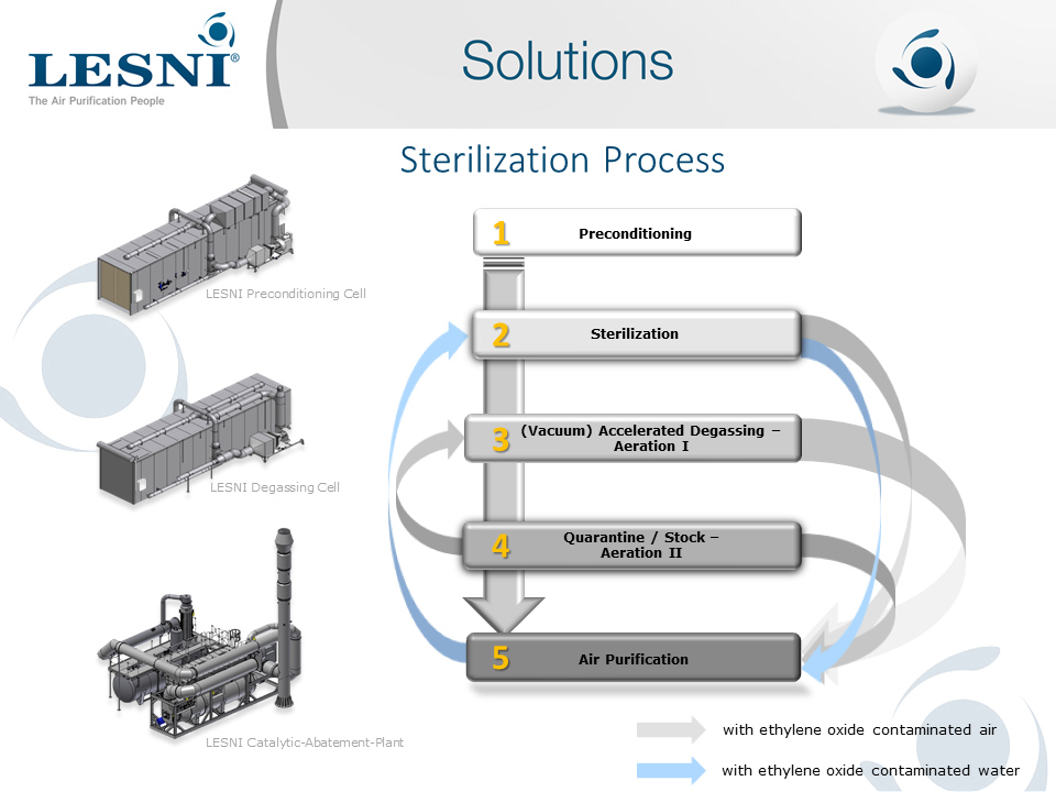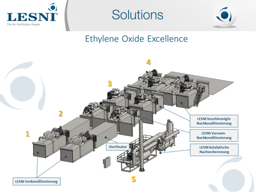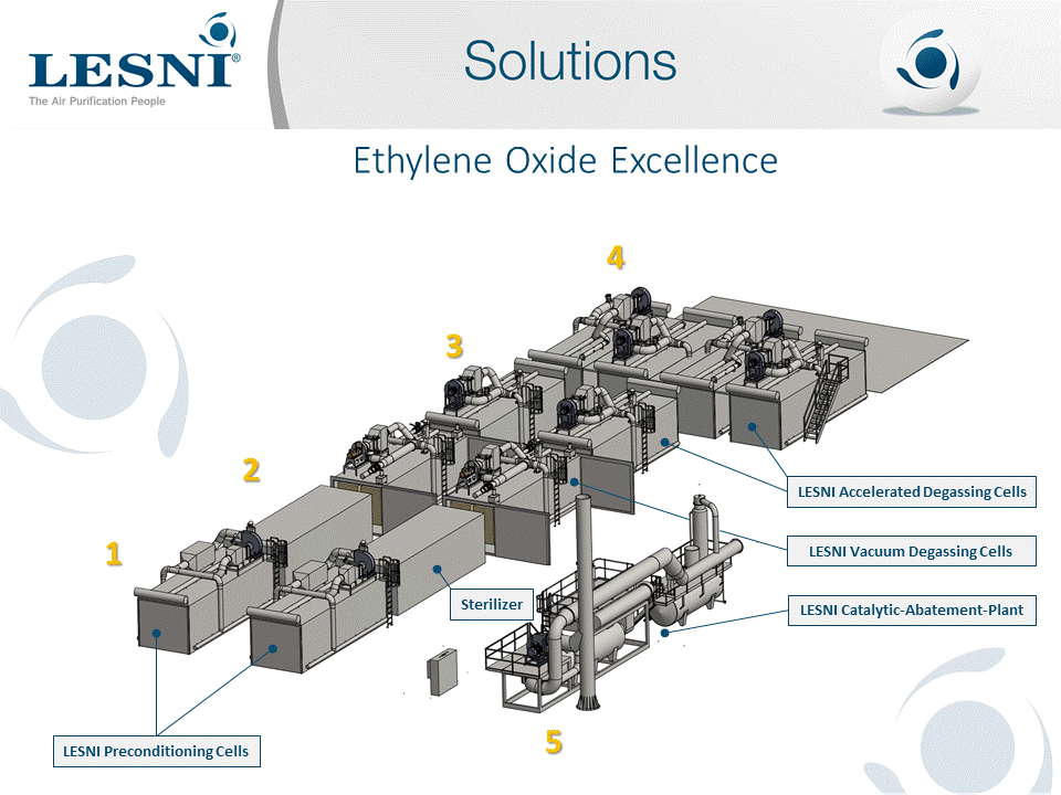 The complete safe solution for all ethylene oxide process emissions. LESNI's innovative and proven solution purifies the emissions from the sterilisation of medical devices. This delivers a safe and reliable "state of the art" system that meets the current stringent regulation with high destruction efficiency.