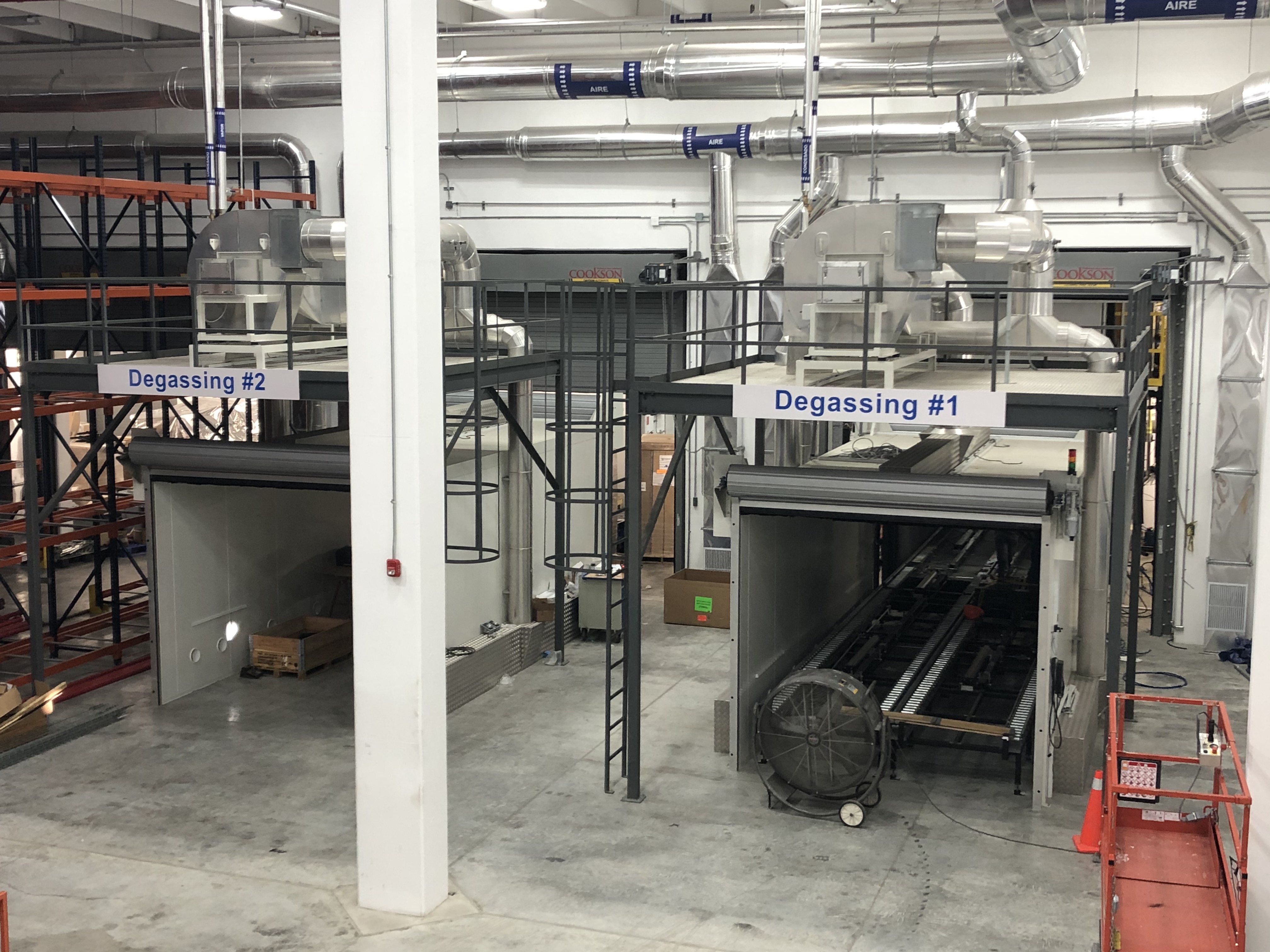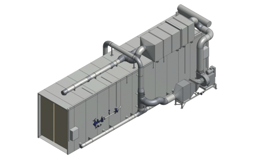 Similar to standard Degassing Cell, a minimum air circulation rate will be targeted to achieve necessary turbulence throughout the cell. Also, the air flow will be distributed and balanced along the full length of the cell to give an even distribution of cell temperature and air flow conditions throughout the load. The inlet and outlet ducting will be designed to give the best atmosphere flow across the surface of all the product within the cell.
